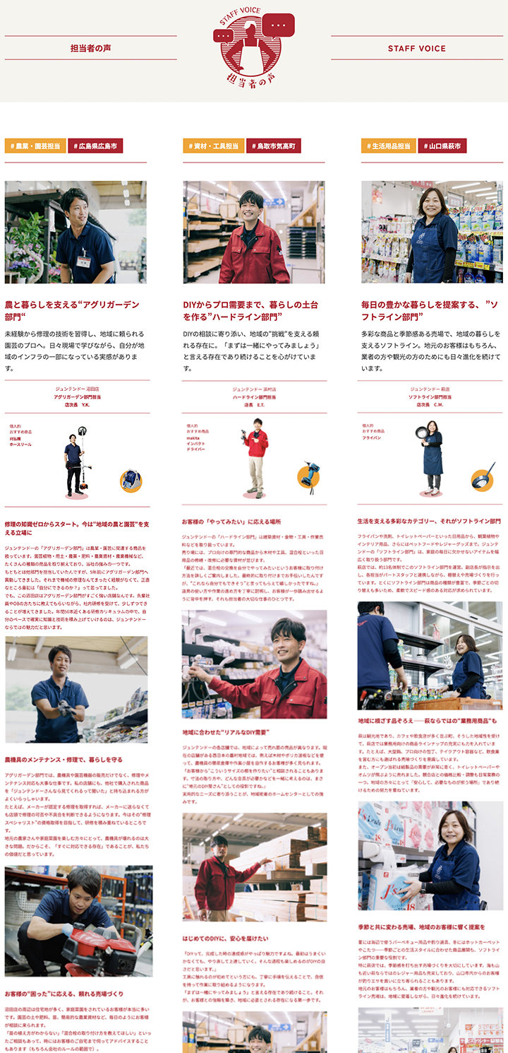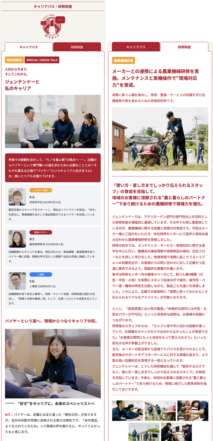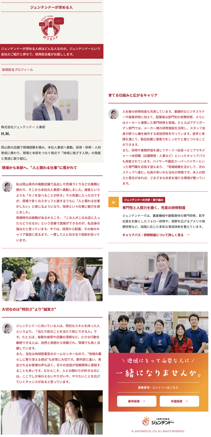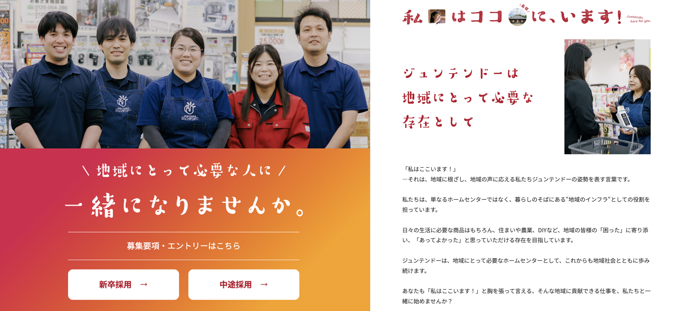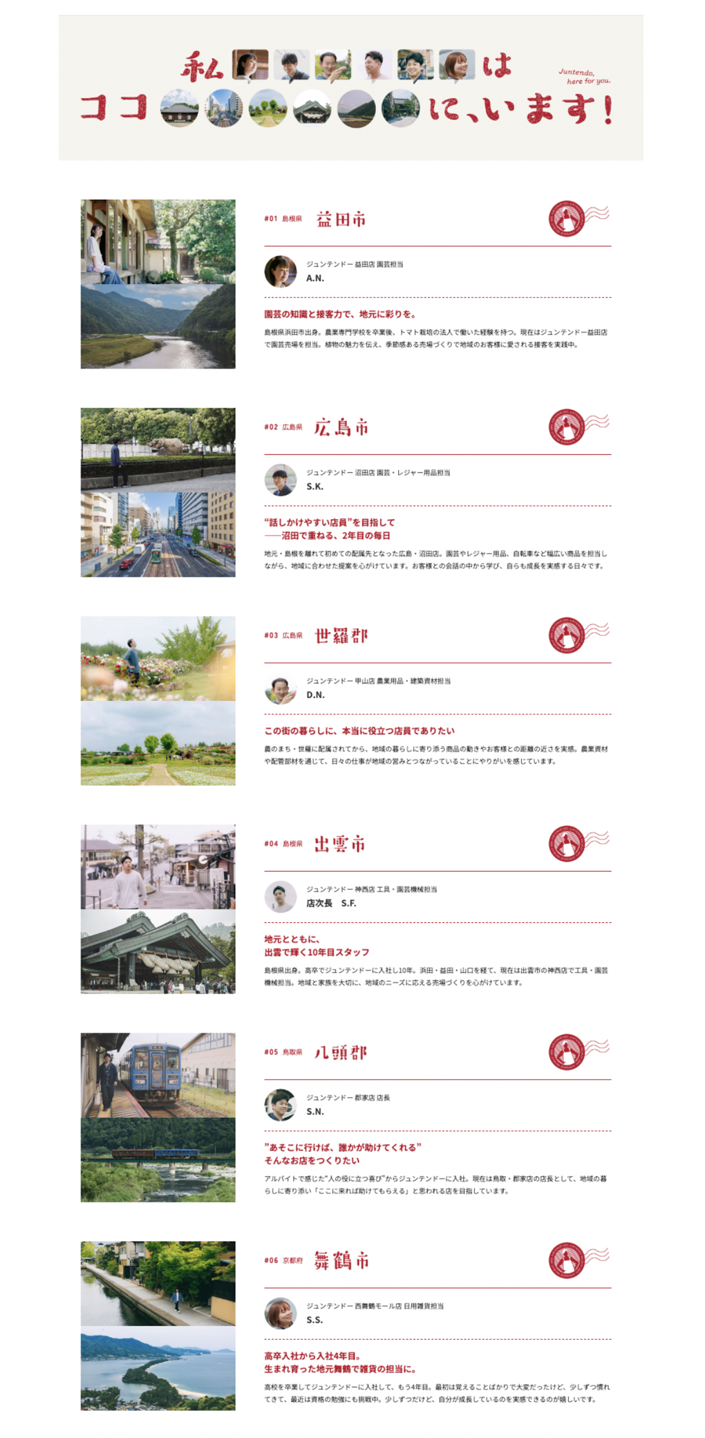 全国展開ではなく、「地域密着」で展開する企業だからこそ、勤務地の“まち”を紹介するコンテンツを充実させました。店舗所在地や周辺環境の魅力、地域で暮らすスタッフのエピソードなどを通して、単なる就職先ではなく「この地域で暮らす・働く」というライフスタイル全体を描きます。地元での仕事を考える応募者にとって、暮らしと仕事の接点が見えることで、安心感と将来へのイメージがより明確に伝わるような設計としました。