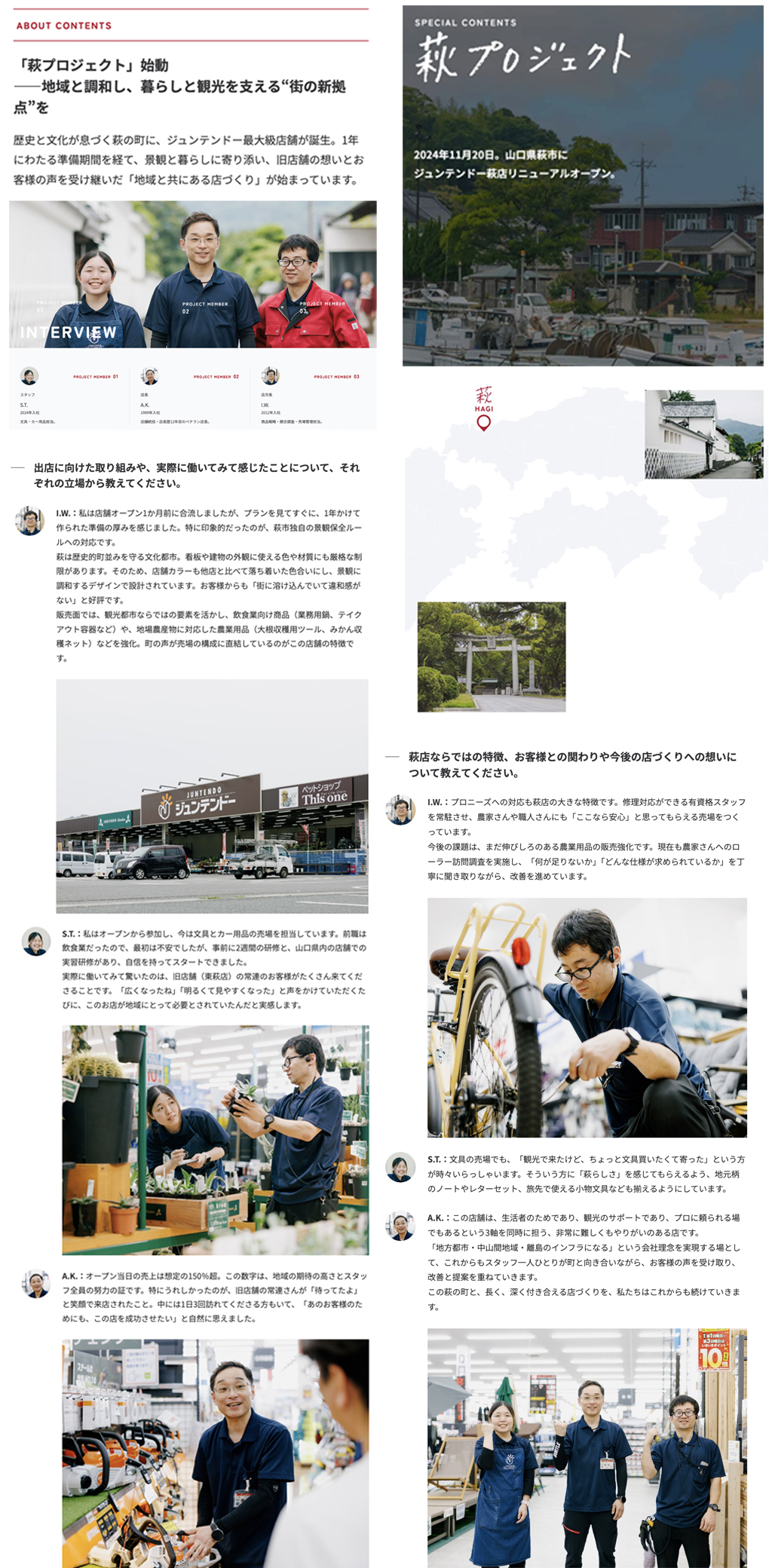 「萩プロジェクト」では、山口県萩市における店舗リニューアルの背景・目的に加え、地域との共生に向けた取り組みをご紹介しています。地域との深いつながりや、入社後に関わる可能性のあるプロジェクトの一例として、“地域と共に歩む企業”としての姿勢と展望を実感できるコンテンツに仕上げました。